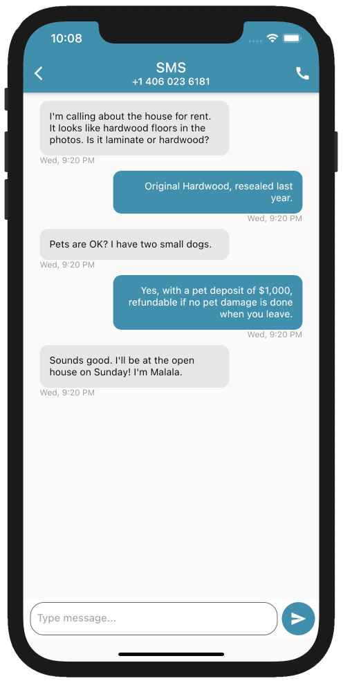 Send and Receive SMS messages easily on your mobile device. Matching Contacts will show names instead of phone numbers. Works like your native Messages app.